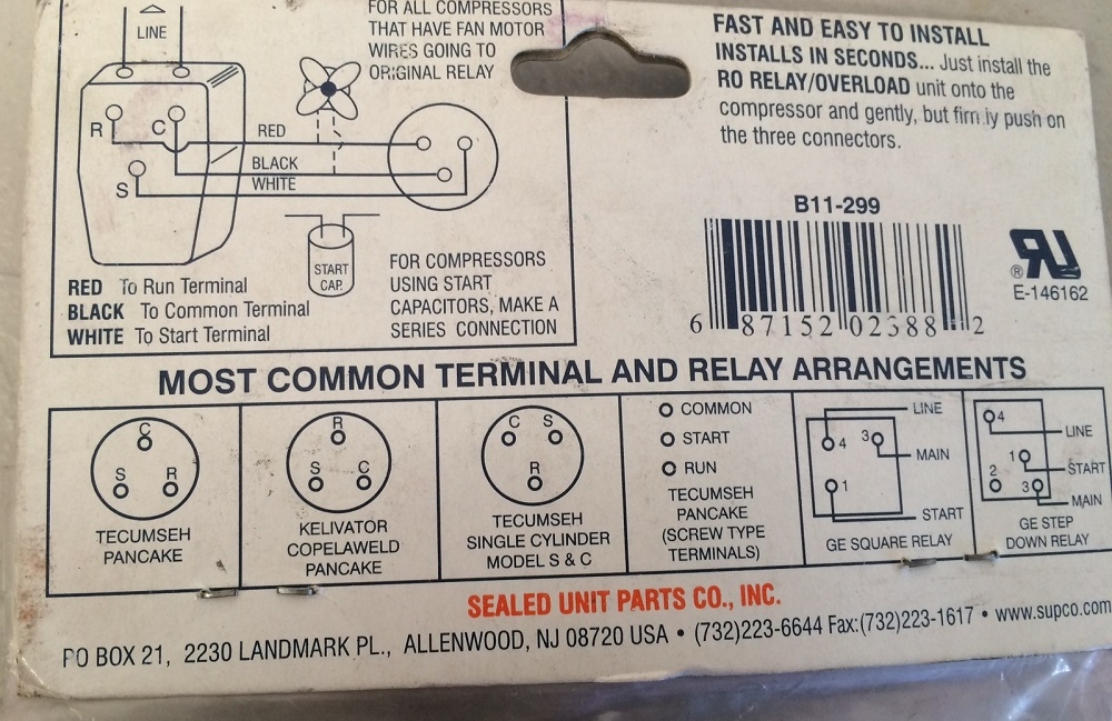 Supco Universal Solid State Overload/Start Relay to suit most Fridge Compressors from 1/8-1/12HP.Part No. RO82, DR232, RF015B.This relay/overload can be used to replace the separate relay and overload fitted to many refrigerator compressors.Wiring diagrams are included for most common compressors.Suitable for 230-240VAC hermetic compressors from 1/12HP – 1/8HP or 60Watt to 95Watt.Eliminates start winding overheating.Can be used in conjunction with a start capacitor.