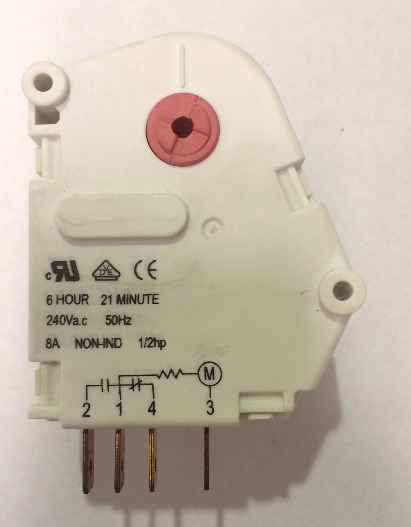 Alt Code: RF096BB, Spec # DBZC-621-1G1.Similar to and can replace RF096, RF096A, RF096G, 758645, 759802.Sonxie defrost timer which switches for 21 minutes every 6 hours.Contacts rated 8amp, 240Volt, 1/3HP.Motor voltage rating 220VAC.4 X 6.4mm spade terminals.Used in some Westinghouse fridges & freezers